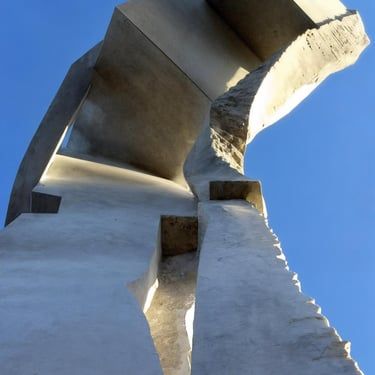 The sculptor Roberto Manzano, dressed in white, uses a hammer and chisel to sculpt a large stone monument against a blue sky.